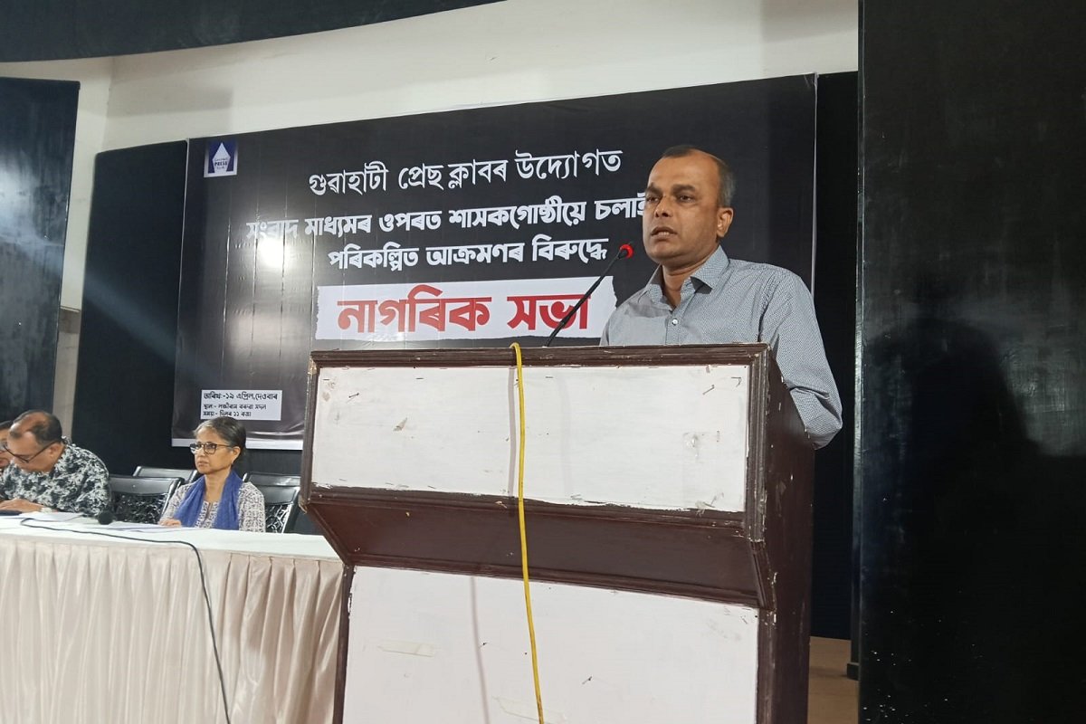 সংবাদ মাধ্যমৰ ওপৰত শাসকগোষ্ঠীয়ে চলাই অহা পৰিকল্পিত আৰু ধাৰাবাহিক আক্ৰমণৰ বিৰুদ্ধে গুৱাহাটী প্ৰেছ ক্লাবৰ আহ্বান মৰ্মে ১৯ এপ্ৰিলত গুৱাহাটীৰ সাহিত্যচাৰ্য লক্ষ্মীৰাম বৰুৱা সদনত এখন নাগৰিক সভা অনুষ্ঠিত হয়। প্ৰাক্তন সাংসদ অজিত কুমাৰ ভূঞা, লেখিকা মাইনী মহন্ত আৰু অধিবক্তা শান্তনু বৰঠাকুৰৰ সভাপতিত্বত অনুষ্ঠিত নাগৰিক সভাখনৰ আৰম্ভণিতে সকলোকে আদৰণি জনায় গুৱাহাটী প্ৰেছ ক্লাবৰ সভাপতি খগেন কলিতাই আৰু উদ্দেশ্য বাখ্যা কৰে সাধাৰণ সম্পাদক অমৰেন্দ্ৰ ডেকাই। সভাত ৰাজ্যৰ বিভিন্ন প্ৰান্তৰ পৰা অহা ডেৰ শতাধিক নাগৰিকৰ লগতে ভিন্ন ৰাজনৈতিক আৰু অৰাজনৈতিক দল সংগঠনৰ প্ৰতিনিধি আৰু বহুসংখ্যক সাংবাদিকেও অংশগ্ৰহণ কৰে। শাৰীৰিক অসুস্থতাৰ বাবে সভাত উপস্থিত থাকিব নোৱাৰা ৰাজ্যৰ বিশিষ্ট বুদ্ধিজীৱী ডঃ হীৰেণ গোহাঁয়ে তেওঁৰ লিখিত উদ্বোধনী ভাষণত অসমৰ সংবাদ মাধ্যমে যি সংকট আৰু প্ৰত্যাহ্বানৰ সম্মুখীন হৈছে, তাক অসমৰ সচেতন দায়িত্বশীল নাগৰিক সমাজে ঐক্যবদ্ধ ভাৱে প্ৰতিৰোধ কৰি গণতন্ত্ৰ ৰক্ষা কৰিব লাগিব বুলি মত প্রকাশ কৰে। ডঃ গোহাঁয়ে সংবাদ মাধ্যমৰ ওপৰত শাসক গোষ্ঠীয়ে নমাই অনা আক্ৰমণৰ বিৰুদ্ধে জনমত গঠনৰ বাবে গুৱাহাটী প্ৰেছ ক্লাবে হাতত লোৱা প্রচেষ্টাক ভূয়সী প্রশংসা কৰাৰ লগতে নাগৰিক সমাজক এই প্ৰচেষ্টাৰ অংশীদাৰ হ’বলৈ আহ্বান জনায়। সভাত অংশগ্ৰহণ কৰি ৰাজ্যৰ বিশিষ্ট আইনজীৱি , মুখ্যমন্ত্ৰী হিমন্ত বিশ্ব শৰ্মাৰ সম্পৰ্কীয় মোমায়েক অনিল কুমাৰ ভট্টাচাৰ্যই আক্ষেপ প্ৰকাশ কৰি কয় যে ৰাইজে বনোৱা নেতাক ৰাইজেই ৰাজপথলৈ নমাই আনিব। আজি তেওঁক ঘৰৰ বুলি কবলৈ লাজ লাগে। ক্ষমতাৰ পৰা আতৰি আহিব লগা হলেই তেওঁ ৰাজপথত ঘুৰি ফুৰিব লাগিব। সভাত ৰাজ্যৰ আন এগৰাকী জ্যেষ্ঠ অধিবক্তা অৰূপ বৰবৰাই শেহতীয়া সময়ছোৱাত সমগ্র দেশৰে সংবাদ মাধ্যমৰ ওপৰত বিজেপি চৰকাৰে চলাই অহা আক্ৰমণৰ বিস্তৃত বিৱৰণ দাঙি ধৰি কয় যে শাসক গোষ্ঠীৰ প্ৰত্যক্ষ আৰু পৰোক্ষ উদগণিত এই আক্রমণ সংঘটিত হৈছে। গুৱাহাটী প্ৰেছ ক্লাৱৰ নতুন নিৰ্মাণৰ বাবে অতি কমেও তিনি বিঘা ভূমি আবন্টনৰ বাবে চৰকাৰৰ ওচৰত দাবী জনাবলৈ এখন ভূমি দাবী সমিতি গঠনৰো পোষকতা কৰে বৰবৰাই। সভাত আনহাতে ৰাজ্যৰ বিশিষ্ট সাংবাদিক হাইদৰ হুছেইনে ভাষণ প্ৰসংগত কয় যে সাংবাদিক আৰু সংবাদ মাধ্যমৰ এই দুঃসময়ৰ বাবে নাগৰিক সমাজো বহু পৰিমাণে জগৰীয়া । সংবাদ মাধ্যমেও নিজক সংশোধন কৰিব লাগিব আৰু তাৰ বাবে নাগৰিক সমাজেও আগবাঢ়ি আহিব লাগিব । সভাত সংবাদ মাধ্যমৰ ওপৰত চলা আক্ৰমণৰ গৰিহণা দি সদৌ অসম ছাত্ৰ সন্থাৰ শিক্ষা সম্পাদক টুটুমণি কলিতাই ভাষণত সংবাদ মাধ্যমৰ প্ৰশ্নৰ মুখামুখি হোৱাৰ সাহস নাথাকিলে মূখ্যমন্ত্রীয়ে সংবাদ মাধ্যমৰ পৰা আঁতৰি থকা ভাল বুলি মন্তব্য কৰে। ইফালে গুৱাহাটী প্ৰেছ ক্