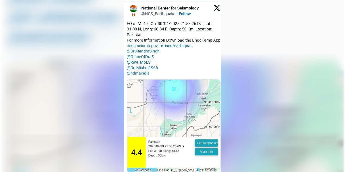 এটাৰ পিছত আনটো বিপৰ্যয়ে লগ নেৰা হৈছে পাকিস্তানক ৷ বুধবাৰে সন্ধিয়া এক ভূমিকম্পই জোকাৰি যায় দেশখনক ৷কেইবাটাও সমস্যাৰে ভাৰাক্ৰান্ত পাকিস্তানত প্ৰকৃতিৰ লীলা প্ৰদৰ্শন ৷ শেহতীয়াকৈ পহলগামৰ সন্ত্ৰাসবাদী আক্ৰমণৰ পৰা সংবাদ শীৰ্ষত থকা পাকিস্তানৰ ওপৰত ভাৰত চৰকাৰে তাৎক্ষণিকভাৱে কাৰ্যকৰী হোৱাকৈ লৈছিল কেইবাটাও গুৰুত্বপূৰ্ণ সিদ্ধান্ত ৷সিন্ধু জল চুক্তি বাতিল, পাকিস্তানী নাগৰিকৰ ভিছা বাতিল, আটাৰী-ৱাঘা সীমান্ত বন্ধকে ধৰি বহুকেইটা গুৰুত্বপূৰ্ণ বিষয় আছিল ইয়াৰ অন্তৰ্গত ৷ ৰাজনৈতিভাৱে হওক বা আন আন দিশতে হওক, আঁতৰা নাই পাকিস্তানৰ বিপদ ৷বুধবাৰে নিশা দেশখনত অনুভূত হয় ভূমিকম্পৰ জোকাৰণি ৷ ৰিখটাৰ স্কেলত এই ভূমিকম্পৰ প্ৰাবল্য আছিল ৪.৪ ৷ ৰাষ্ট্ৰীয় ভূমিকম্পবিজ্ঞান কেন্দ্ৰই সদৰী কৰিছে এই তথ্য ৷ Share this:FacebookX Related Post navigation কেঁচা পিয়াঁজৰ উপকাৰী গুণৰ বিষয়ে জানেনে চিএমএফ বাই নথিং-য়ে চিএমএফ ফোন ২ প্ৰ’ আৰু বাডচ ২ চিৰিজ উন্মোচন কৰে
